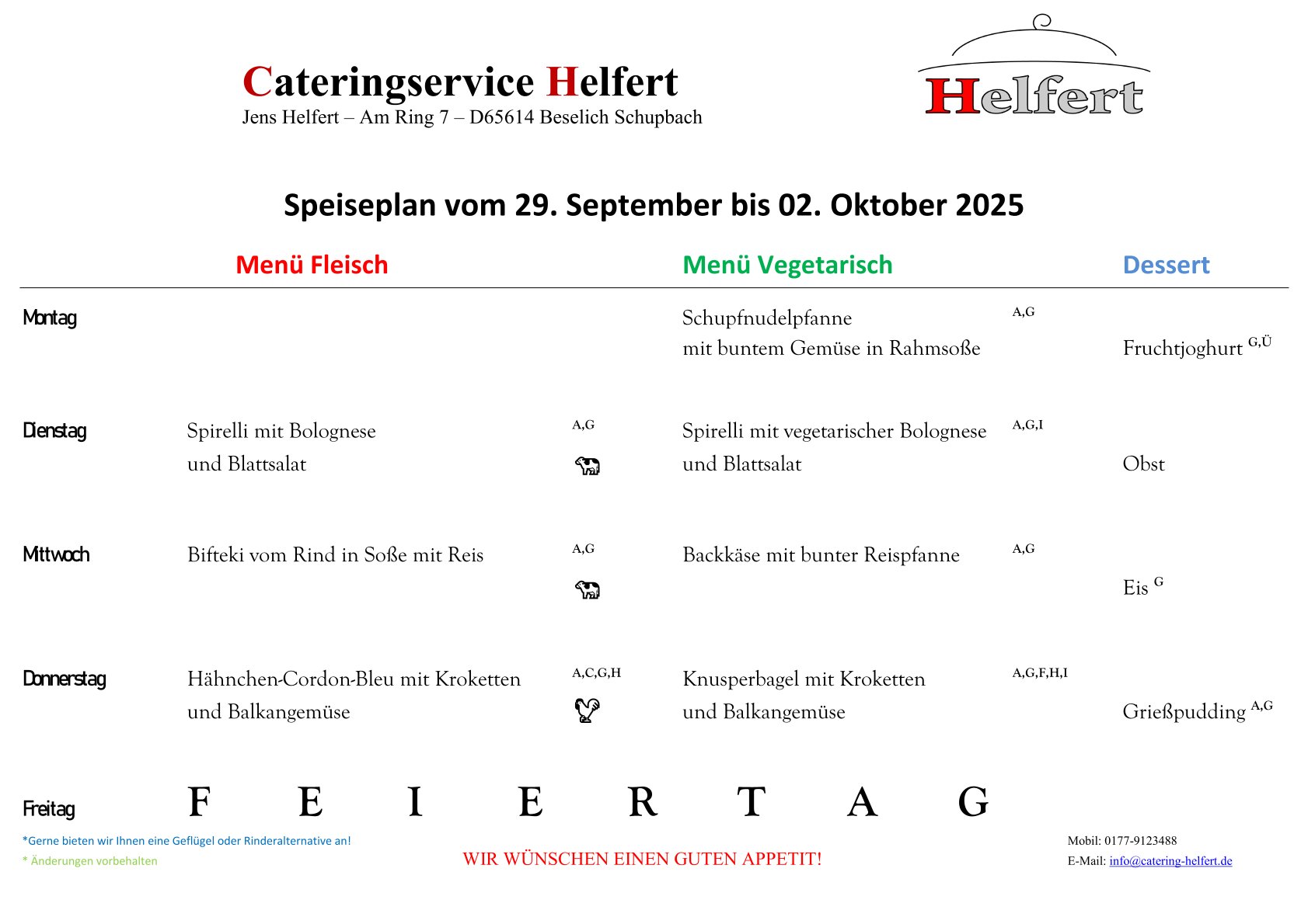 Speiseplan vom 29.09.2025 bis 02.10.2025