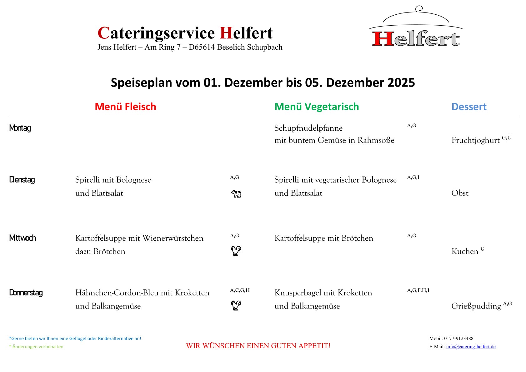 Speiseplan vom 01. Dezember bis 05. Dezember 2025
